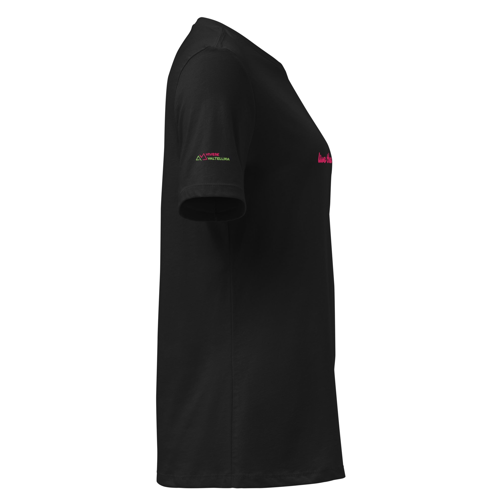 Sul petto al centro è ricamato il motto di Vivere Valtellina, mentre sulla manica destra è ricamato il logo.